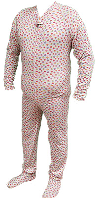 Please be sure to actually measure your dimensions and don't just assume that these sizes are comparable to other products. Polar Fleece is a synthetic fabric and has very minimal shrinkage. Even washed hot and dried hot (which we don't recommend) the shrinkage is only about 5 percent. Start your size selection by measuring the height of your shoulder while standing barefoot. The size table dimensions are taken with the jammie laying flat while you are not flat so you will not be able to use these measurements directly. They are an aid to help you obtain the right size. An approximate size example would be the large size will fit 5'7" to 5'9" tall and 170 pounds to 200 pounds but different bodies will fit them differently. A taller and thinner baby might fit the same size as a shorter but heavier baby. You may like them loose or you may like them tight. Check to be sure you have adequate length from your shoulder to crotch. Note the sleeve measurement runs from the collar over the shoulder extending to the end of the arm. They are cut full to accommodate double night diapers.